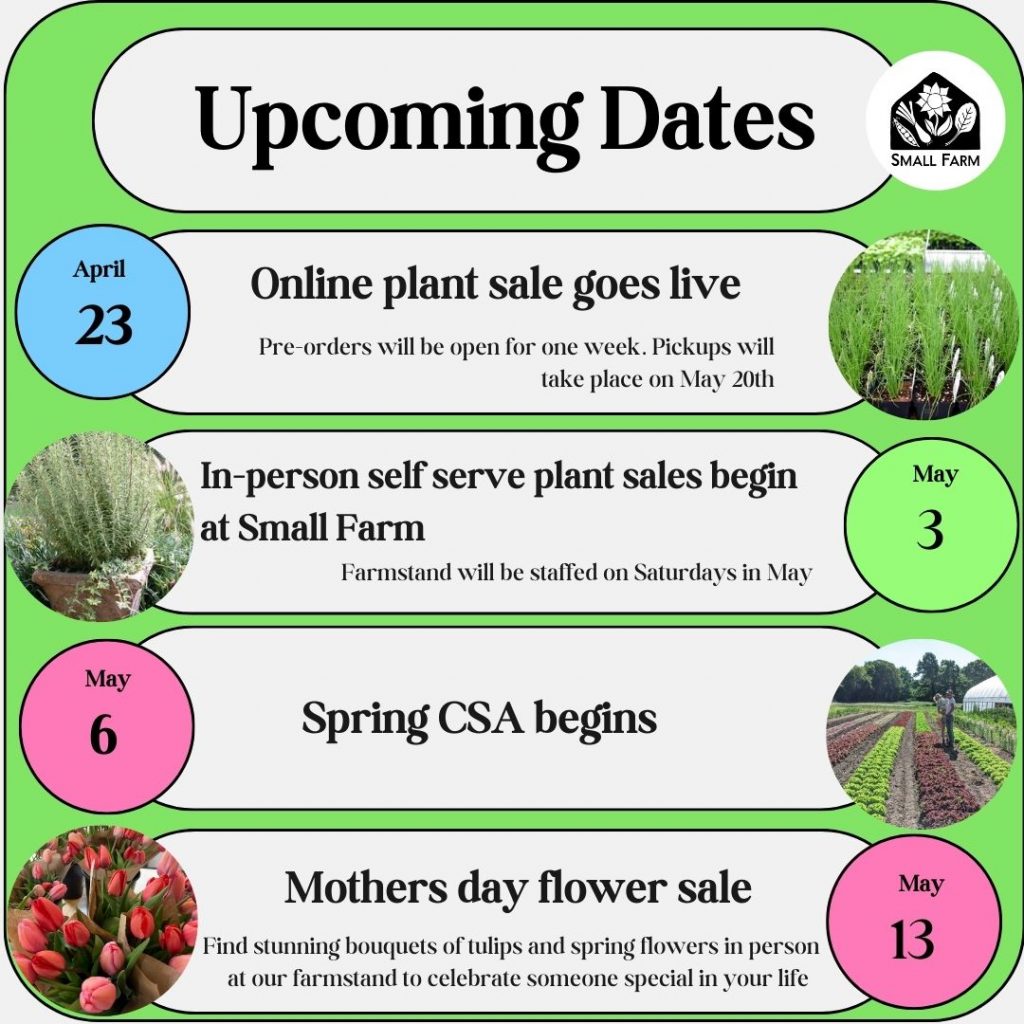 There’s so much hustle and bustle around Small Farm now that Spring is in the air. We are gearing up for our annual plant sale, and our Spring CSA is just around the corner. We still have Spring CSA shares available! Our high tunnels are flush with color, and our first in-ground plantings have already taken place. We’re feeling revved up and in high spirits for the opening of our season!